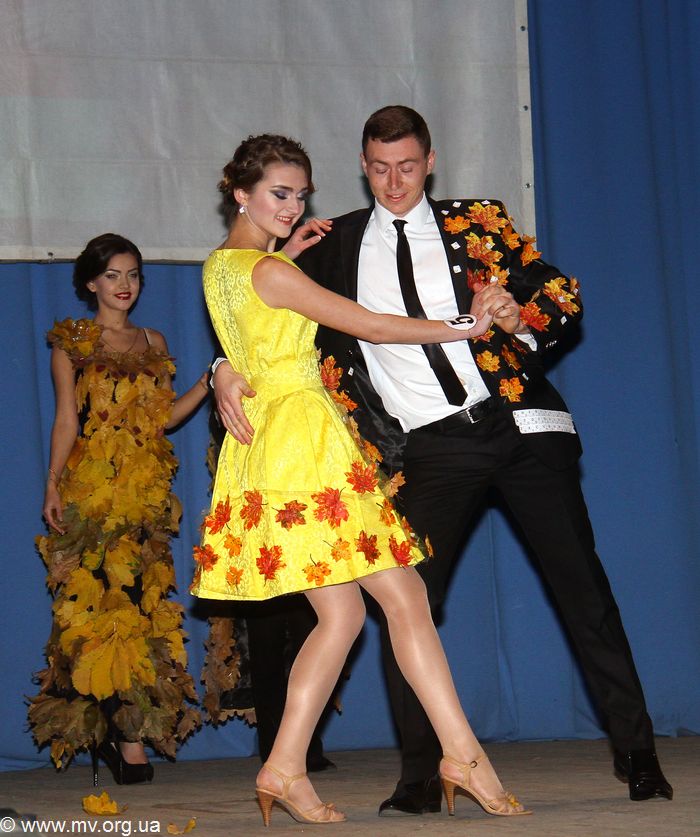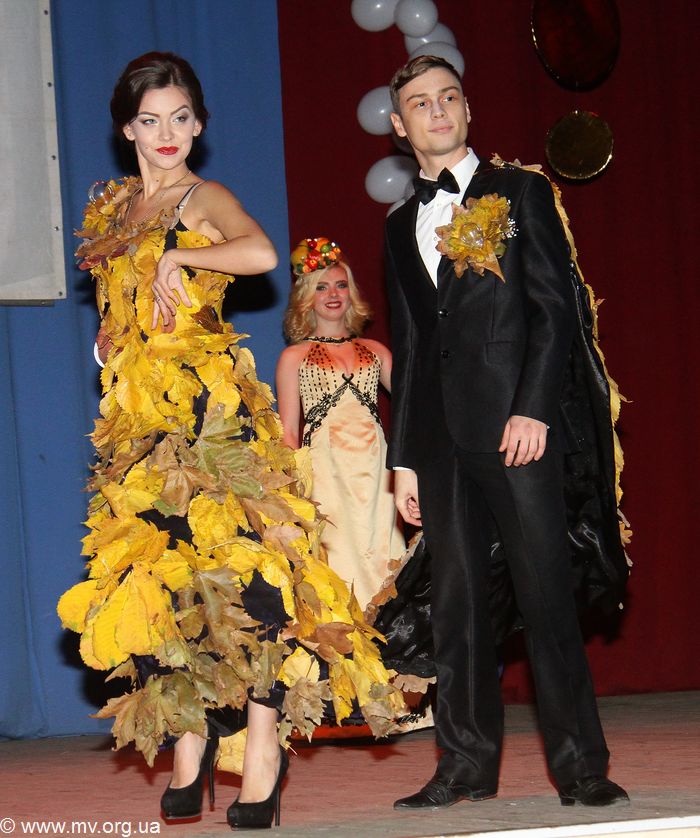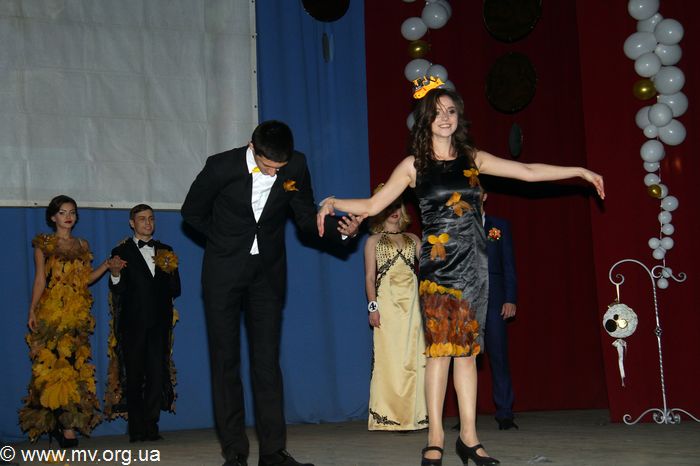 Начался вечер со знакомства с парами участников - представителями каждого факультета вуза. Во время знакомства пары продемонстрировали и свою креативность в презентации осеннего костюма. Так, энергетики Светлана Ващенко и Виталий Рогожкин проявили фантазию, и костюм участника дополнил длинный плащ из осенних листьев.