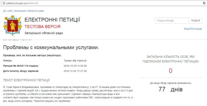 Пока сервис работает в тестовом ресурсе. Однако первая настоящая петиция на сайте уже появилась. Ее оставила жительница Энергодара, которая жалуется на проблемы ЖКХ в своем доме.