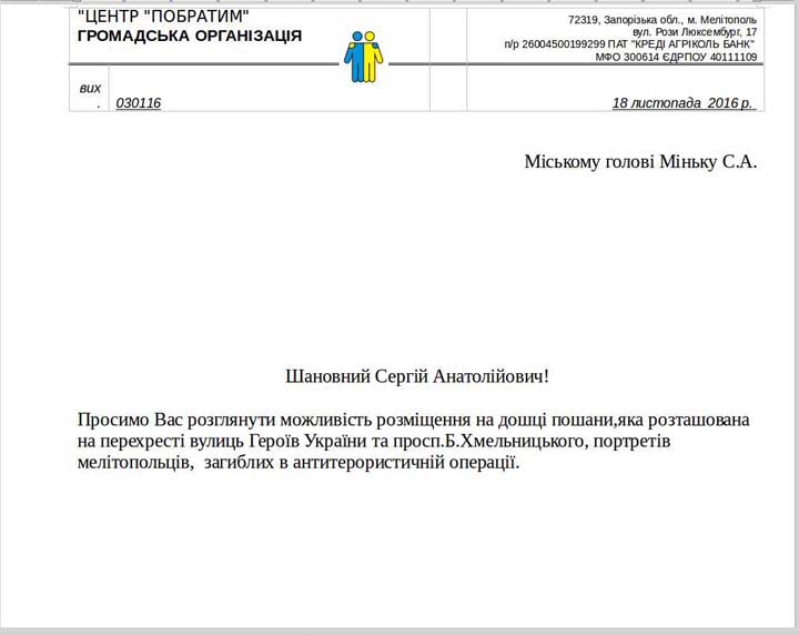 "Уважаемый Сергей Анатольевич, просим вас рассмотреть возможность размещения на доске почета... портретов мелитопольцев, погибших в Антитеррористической операции", - обратились члены общественной организации "Побратим" к мэру.