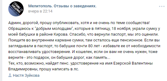 Об этом написала в соцсетях ее внучка. Девушка рассчитывает, что запись прочтут воры и вернут ее бабушке и пенсионное удостоверенее, тем самым избавив пожилую женщину необходимости восстанавливать документы. Паспорт, находившийся в похищенной сумке, преступники владелице вернули.