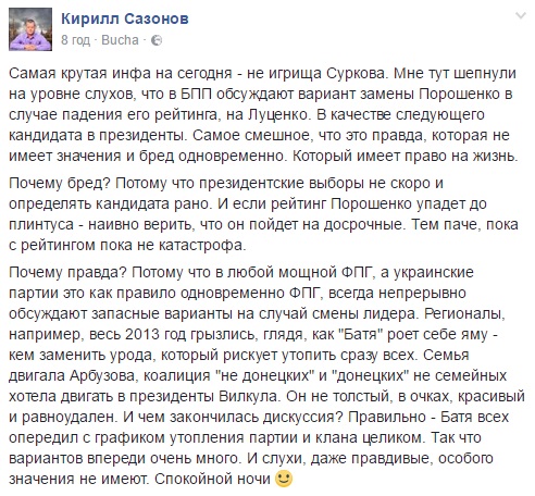 "Мне тут шепнули на уровне слухов, что в БПП обсуждают вариант замены Порошенко в случае падения его рейтинга на Луценко. В качестве следующего кандидата в президенты. Самое смешное, что это правда, которая не имеет значения, и бред одновременно. Который имеет право на жизнь", - написал он в соцсети.