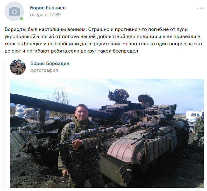 Об этом сообщает ONLINE.UA со ссылкой на ВКонтакте пользователя Бориса Енакиева. "Борис, ты был настоящим воином. Страшно и противно что погиб не от пули укроповской, а погиб от побоев нашей доблестной ДНР "полиции" и ещё привезли в морг в Донецке и не сообщили даже родителям. Браво-только один вопрос за что воюют и погибают ребята, если вокруг такой беспредел", — написал Борис Енакиев.
