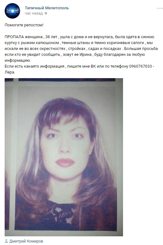 "ПРОПАЛА женщина , 38 лет , ушла с дома и не вернулась, была одета в синюю куртку с рыжим капюшоном , темные штаны и темно коричневые сапоги , мы искали ее во всех окрестностях , стройках , садах и посадках . Большая просьба если кто ее увидит сообщить , зовут ее Ирина , буду благодарен за любую информацию.