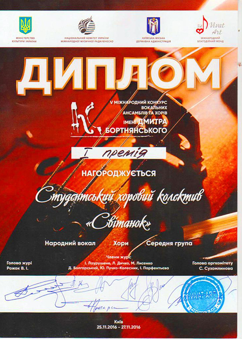 Студенческий хоровой коллектив "Світанок" Мелитопольского училища культуры победил на V Международном конкурсе вокальных ансамблей и хоров имени Дмитрия Бортнянского, который проводился 24-27 ноября в Киеве.