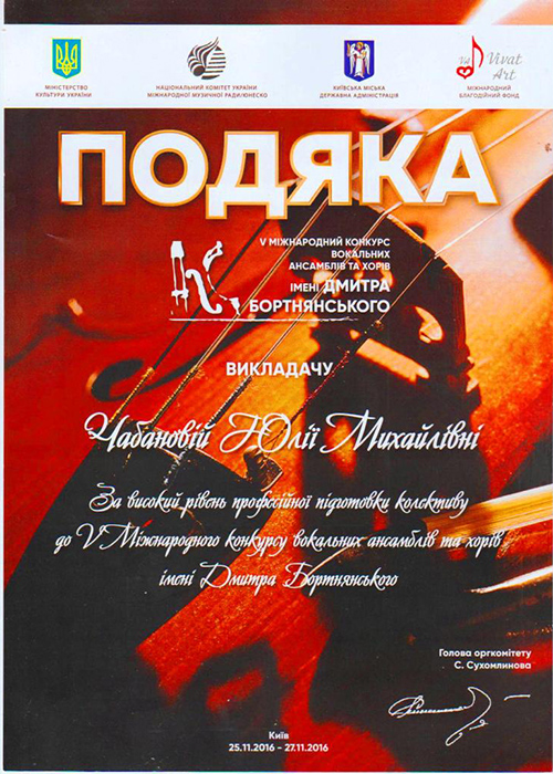 По словам преподавателя предметно-цикловой комиссии дирижерско-хоровых дисциплин МУК Алины Юдиной, конкурс носит имя одного из самых выдающихся украинских композиторов - Дмитрия Бортнянского, творчество которого стало частью не только национальной, но и мировой культуры. Этот международный конкурс был основан в 2010 г. в Киеве благотворительным фондом "ВИВАТ АРТ", а организационно его поддерживает Национальный комитет музыкального Совета ЮНЕСКО при содействии Министерства культуры Украины и Киевской городской госадминистрации. Основной целью конкурса является распространение творческого и духовного наследия великого композитора Д. Бортнянского.