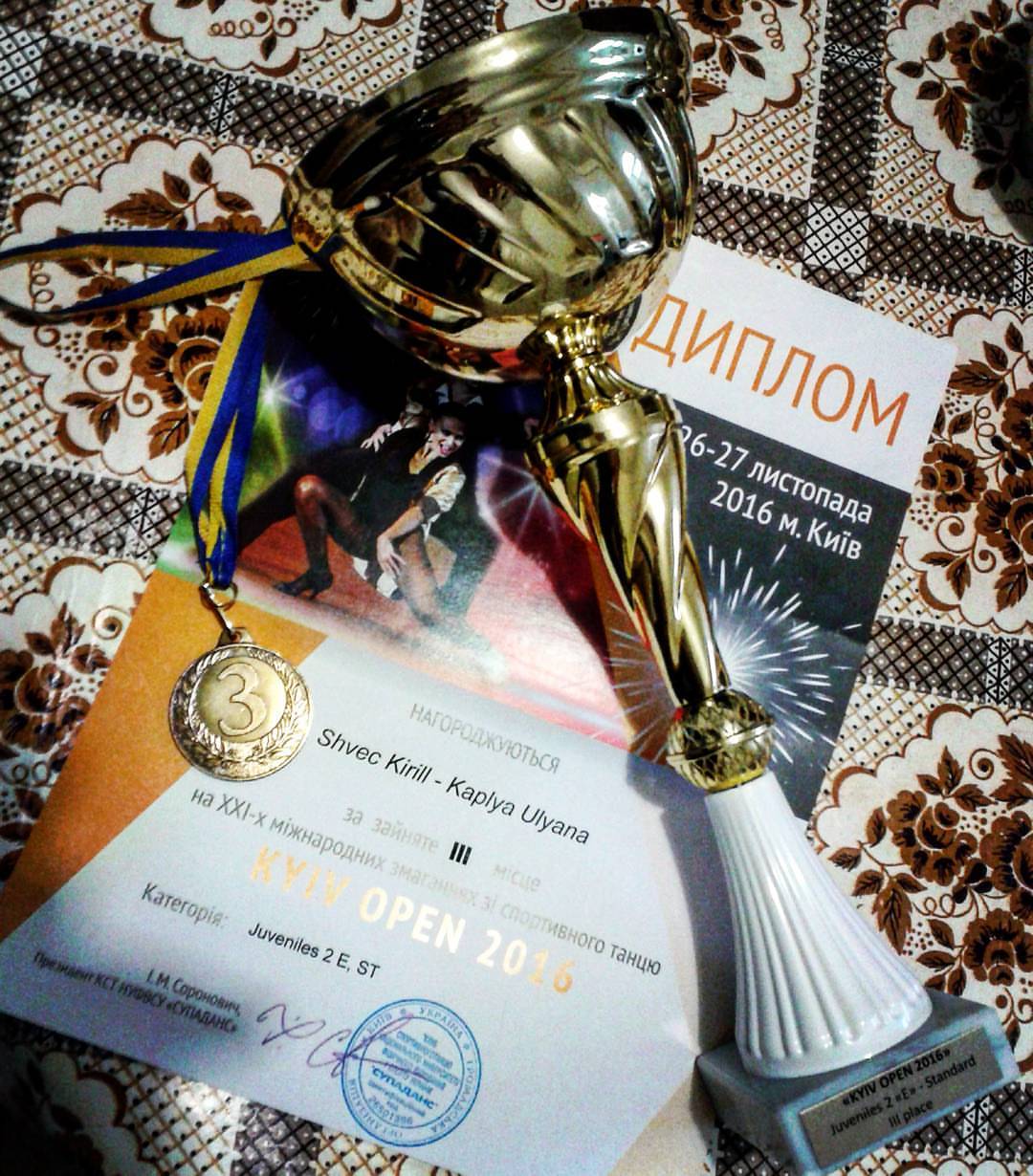 В категории "Ювеналы 2 E" на паркет вышли воспитанники клуба спортивного бального танца "Феерия" (руководители Алина Бисерова и Виталий Малашенко) Ульяна Капля и Кирилл Швец. Следует отметить, что в этой категории за призовые места сражались 20 пар из Киева, Харькова, Вышгорода, Бердянска, Краматорска, Ивано-Франковска, Одессы и Запорожья. Наша пара завоевала третье место престижных международных соревнований.