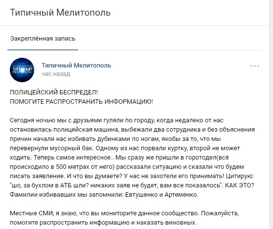 В одном из мелитопольских пабликов люди жалуются на произвол полицейских, избивших их.