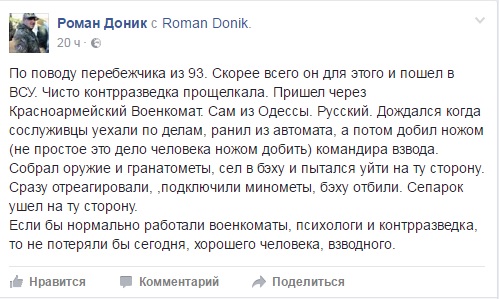 Волонтер Роман Доник озвучил имя бойца, который убил своего командира и перешел на сторону врага. Им оказался уроженец Одессы, служащий 93 бригады.