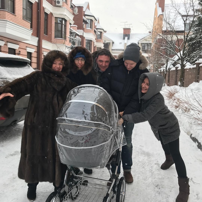 "Первая прогулка! И сразу семейная драка "Кто повезёт коляску?!!", — подписала Ксения фото, где они с мужем и родственниками "не могут поделить коляску".
