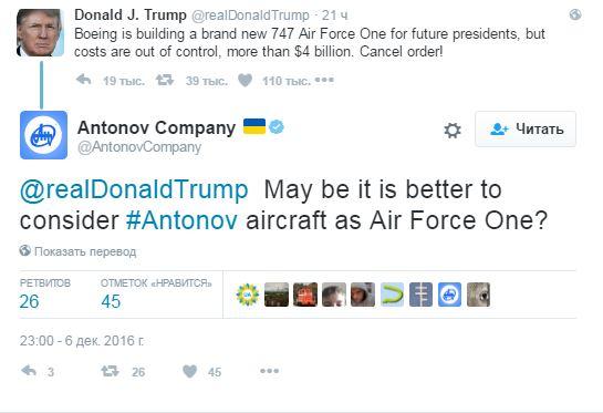 Неожиданно для всех на арену вышел украинский «Антонов», предложив Трампу украинский самолет. Пока что реакции от президента США нет, но ведь Украина действительно может сделать достойный авиалайнер за вменяемые деньги. К тому же, он вполне может стать еще и самым большим самолетом, если взять за основу легендарный самолет «Мрия».