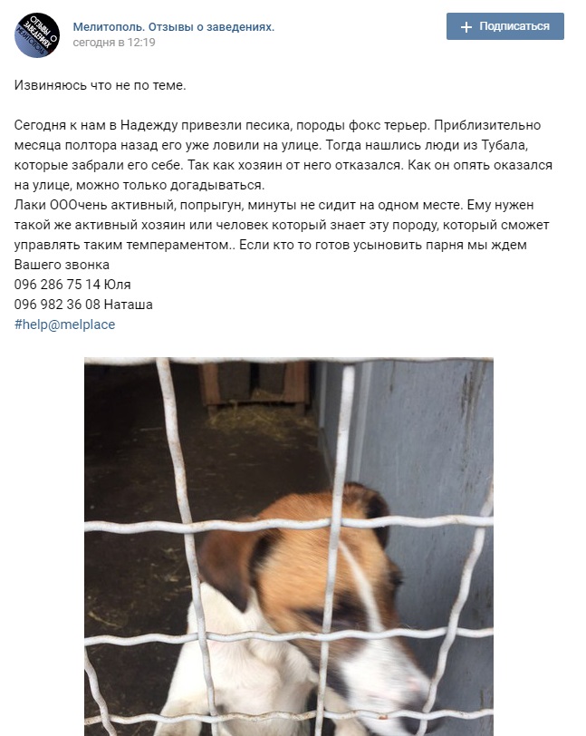 "Сегодня к нам в Надежду привезли песика, породы фокс терьер. Приблизительно месяца полтора назад его уже ловили на улице. Тогда нашлись люди из Тубала, которые забрали его себе. Так как хозяин от него отказался. Как он опять оказался на улице, можно только догадываться.