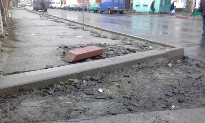 Движение по улице пока не открыто - на въезде установлены запрещающие знаки и даже лежит металлический профиль, который благополучно объезжают машины и автобусы. А пешеходам приходится перепрыгивать через ямы, оставшиеся от демонтированных бордюров и внимательно смотреть под ноги, чтобы не вступить в разлитую смолу и не споткнуться о строительный мусор.