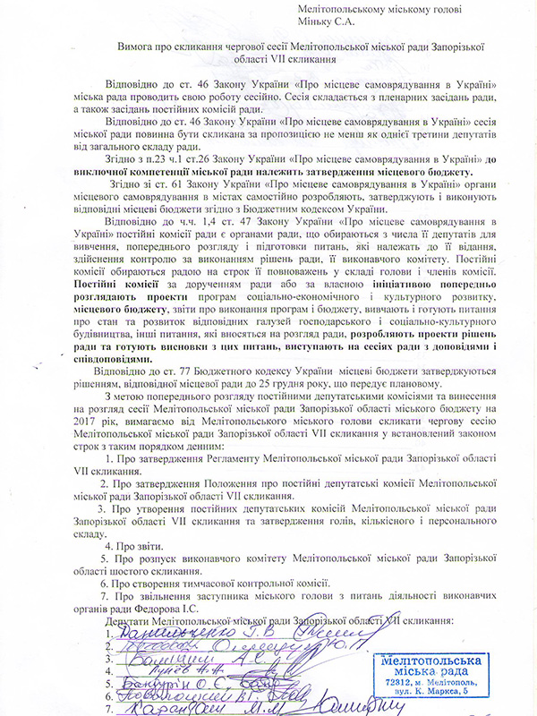 Пока в сессионном зале Мелитопольского горсовета продолжается обсуждение целевых бюджетных программ на 2017 г., шестнадцать депутатов подали в аппарат совета требование о созыве очередной сессии.