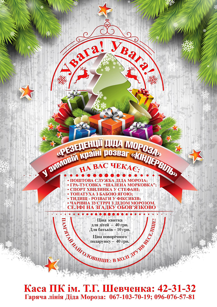 В двадцатых числах декабря мелитопольский ДК им. Т. Шевченко превращается в зимнюю страну развлечений "Киндервиль" и с 27 декабря здесь начинает свою работу "Резиденция Деда Мороза".