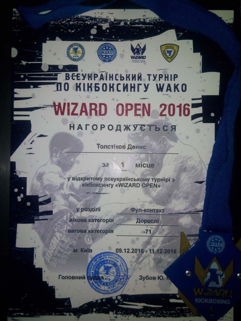 За награды турнира "Wizard Open-2016" в разделах "фул-контакт", "лоу-кик" и "К-1" сражались спортсмены из 18 областей Украины и команда из Молдовы. По словам тренера спортивного клуба "Спартак" Виктора Савченко, его воспитанник, кандидат в мастера спорта Украины по кикбоксингу Д. Толстиков выступал среди взрослых в весовой категории 71 кг в разделе "фул-контакт". Успешно проведя два боя, Денис уверенно завоевал первое место.