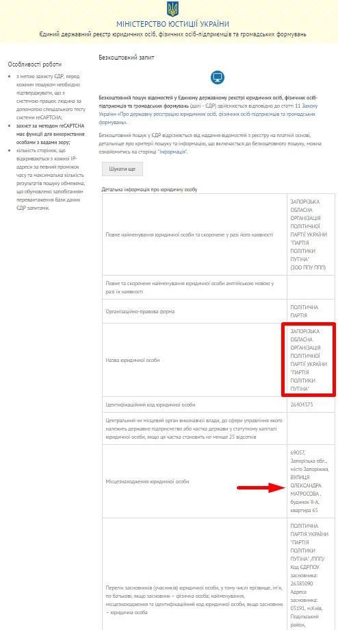 Министерство юстиции Украины не считает нужным проверить деятельность Запорожской областной организации политической партии Украины "Партия политики Путина" и продолжает вносить ее в свои реестры.
