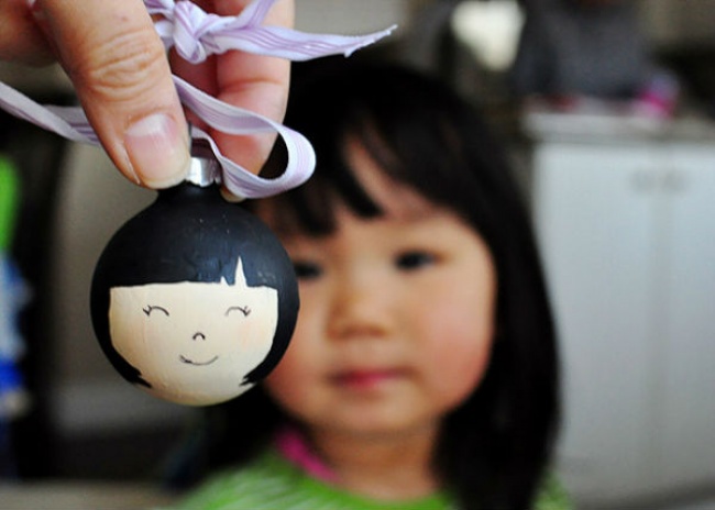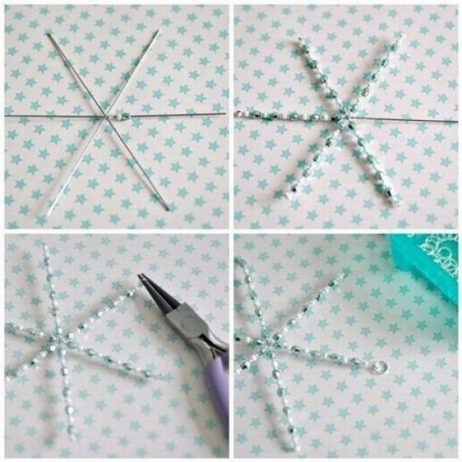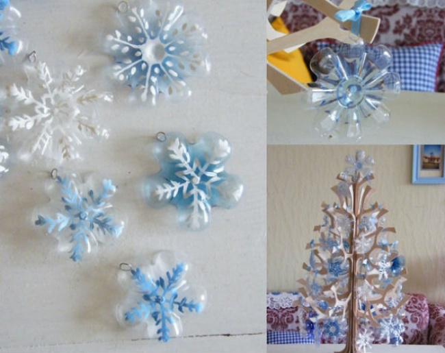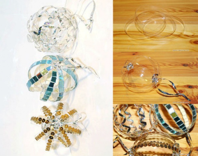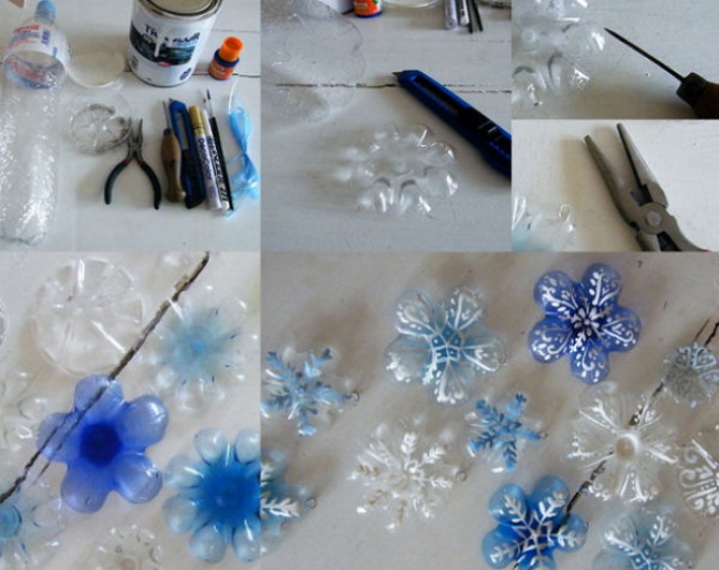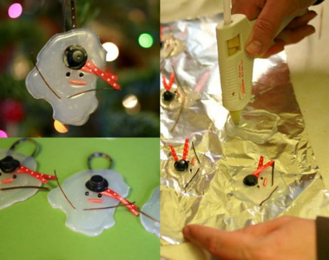 Отрезать низ бутылки, шилом сделать дырочку, нарисовать снежинку. Наверно в них и колечко не нужно, если вместо ленточки взять тонкую нитку.
