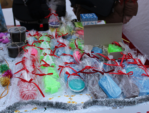 В одной из палаток, рядом с прочими вещами, продавщицы разложили мыло ручной работы. Учитывая приближающиеся праздники, оно сделано на новогоднюю тематику: мыло в виде мандаринок с их запахом, мятные и лаймовые елочки, а также брусочки с пожеланиями "Счастливого Нового года" или предназначенные "Любимому мужчине". А рядом с новогодним мылом торгуют вкусными новогодними пряниками. Для тех, кого интересует не только новогодняя атрибутика, в палатках выложены украшения из бисера, таблички с молитвами и вышиванки. Кроме того, на вышиванку можно заказать на сайте leosouvenir.com.ua.