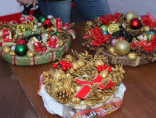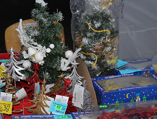 За первым же столиком можно было увидеть небольшие шкатулочки и ободки, украшенные ракушками. А рядом с ними продавцы разложили мягких петушков, новогодние мешочки и поставили большую шкатулку, стилизованная елочными веточками и лентами цвета приближающегося года - красными. Немного дальше продавали новогодние венки, тоже ручной работы. Сделаны они не из хвойных веток, поэтому прослужат не один год. Декорированные тканью, они густо украшены игрушками, орешками, шишками и ленточками-бантиками. Такая красотища, повешенная на дверь, сразу прибавит праздничного настроения. Да и цена сравнительно приемлемая - от 150 до 260 грн.