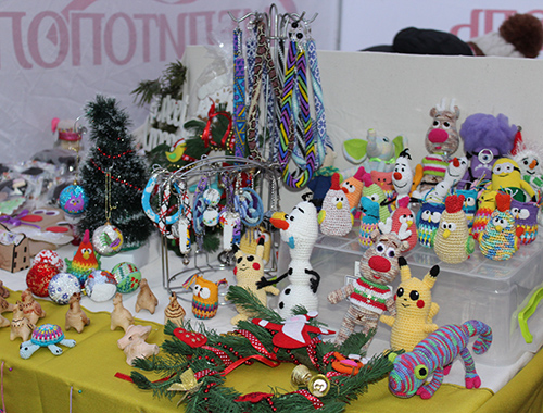 Тут же можно было купить и различные игрушки, правда, не елочные. В одной палатке можно увидеть вязанного спицами веселого снеговика из мультфильма "Холодное сердце" или же олененка с красным носом. По одной из легенд, носик именно такого цвета имеет главный олень в упряжке американского Санты. В этой же палатке можно купить вязанную копию Пикачу, знаменитых во всем мире миньонов, забавных совушек и цыплят. А в палатке напротив для покупателям предлагают тканевых снеговичков и необычные елочные игрушки - куклы-мотанки в виде ангелочков.