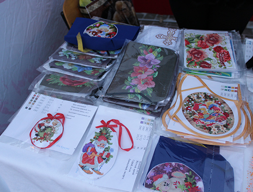 Есть что прикупить и тем, кто любит заниматься рукоделием сам. В одной из палаток руковдельница Наталья продает схемы для вышивки бисером. На столике выложены уже расшитые косметички, чехольчики и обложки на паспорта, для праздников приготовлены елочные игрушки и "фартушки" на бутылки с новогодними мотивами. Рукодельницам нужно только подобрать бисер и потратить немного времени, чтобы получилась красота.