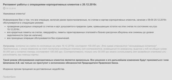 Сегодня утром были заморожены деньги на счетах корпоративных клиентов Приватбанка.