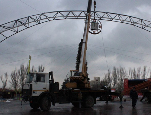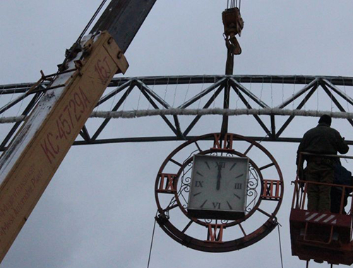 Часы крепят на арку, установленную у входа на площадь. Как сообщили представители КП "Титан", часы будут подсвечиваться изнутри.