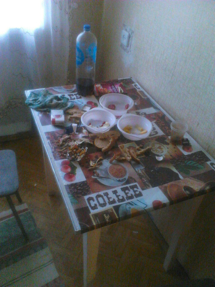 Что-то, видимо, произошло во время застолья, следы которого остались на кухонном столе, после чего молодые люди устроили в квартире погром, оборвав обои даже с потолка.