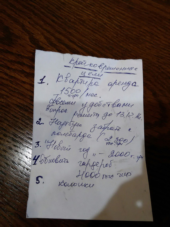 Однако, квартиранты решили обойтись без лишних трат и съехали, не заплатив ни аренду, ни коммунальные услуги. Хотя, судя по списку "кратковременных целей", забытому при отъезде, в планах у них это было, как и обновление гардероба на сумму 4 тысячи, и возврат из ломбарда заложенного ноутбука.