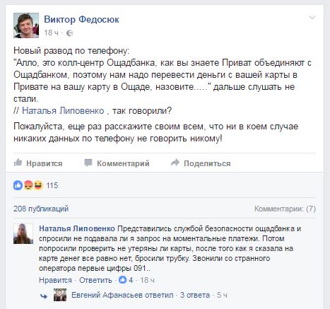 "Алло, это колл-центр Ощадбанка, как вы знаете Приват объединяют с Ощадбанком, поэтому нам надо перевести деньги с вашей карты в Привате на вашу карту в Ощаде, назовите... Дальше слушать не стали," – написал пользователь Facebook Виктор Федосюк.