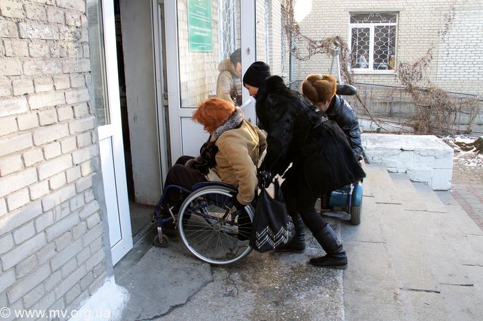 Рядом с «Приватбанком» находится еще одно жизненно важное для человека с инвалидностью учреждение - «Амбулатория общей практики семейной медицины №6» (бывшая детская поликлиника). По пандусу эксперты добрались до входной двери, а здесь нас ожидала мегапроблема: входная дверь узкая, а перед ней на пороге – возвышение. Иннину коляску мы смогли поставить строго перпендикулярно входному проему и с миллиметровым зазором при помощи девушки-посетительницы «вопхнулись» внутрь. А вот Николай остался на пороге. Дело в том, что его электроскутер длиннее порога, если его ставить под углом 90 градусов ко входу (иначе не заедешь). Даже пытаться заехать не стоит – можно так загреметь навзничь! Инна рассказала, что у нее уже был опыт из ряда вон: когда она, почувствовав недомогание, приехала на своем электроскутере сюда в амбулаторию и не смогла войти, то врач слушала ее прямо на пороге заведения (!). «Мне повезло, что тогда было тепло», - горько сказала девушка. А что толку, если заедешь на коляске внутрь: врачи на втором этаже, а в здании нет лифта.
