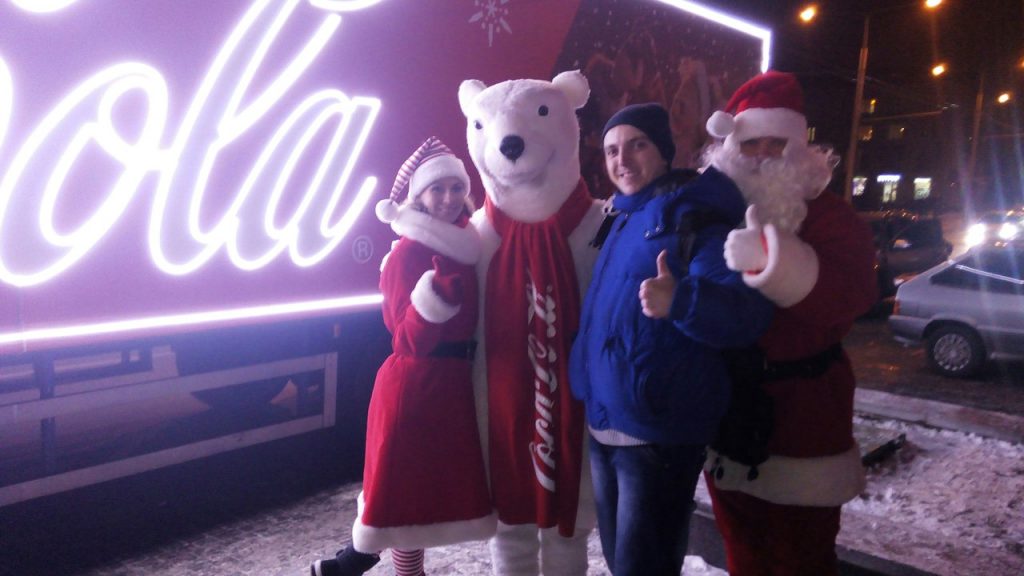 Грузовик делал остановки на площади Маяковского и Фестивальной. Из него вышли аниматоры в костюмах Санта Клауса, белого медведя и других персонажей, которые устроили праздничную программу для маленьких горожан.