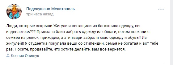 "Люди, которые вскрыли Жигули и вытащили из багажника одежду, вы издеваетесь??? Приехала блин забрать одежду из общаги, потом поехали с семьей на рынок, приходим, а эти твари забрали мою одежду и обувь!! Из жигулей!! Я студентка покупала вещи со стипендии, семья не богатая и вот тебе раз. Носите, продавайте, что хотите делайте, вам всё вернется."