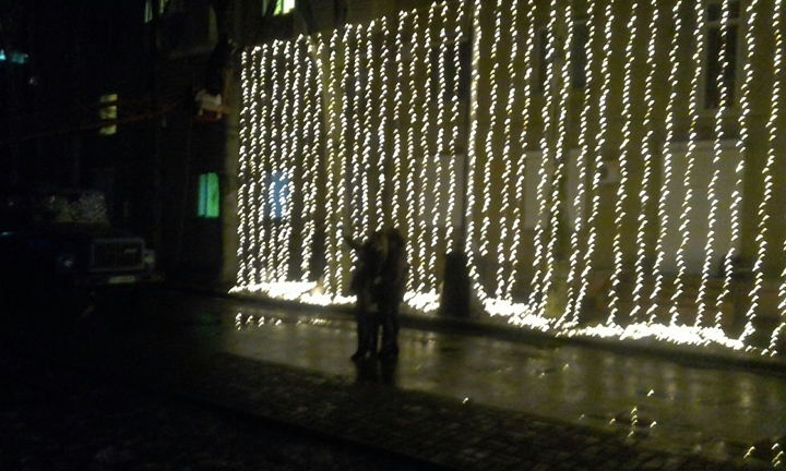 Сегодня вечером сотрудники КП "Горсвет" занялись вывешиванием светящейся арки над вторым въездом на центральную площадь со стороны проспекта. Процесс вызывает у горожан восторг, проходящие мимо спешат сфотографироваться возле светящейся стены еще не прикрепленных до конца гирлянд.