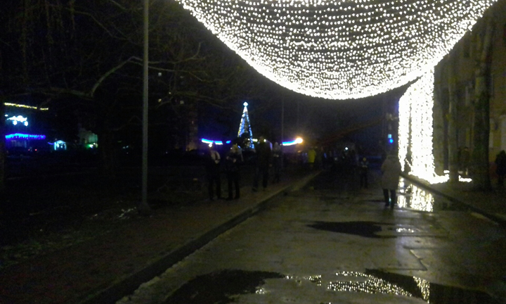 К слову сказать, первая арка светилась только в воскресенье, когда ее вывесили. Вот уже несколько дней над проездом висит не горящая даже в темное время суток иллюминация. А вот патриотические сине-желтые гирлянды по бокам центральной арки светятся исправно.