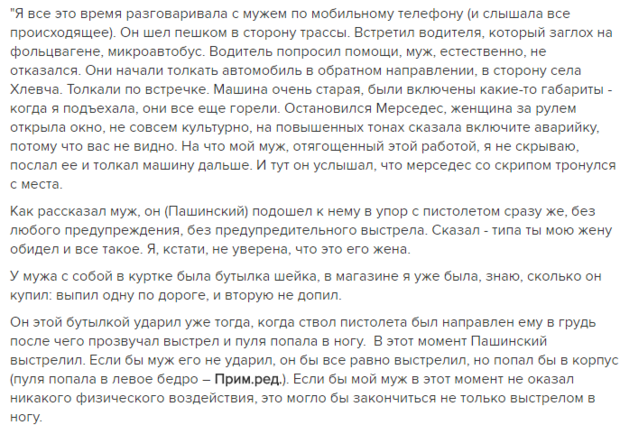 По словам женщины, она все это время разговаривала с мужем по мобильному телефону и слышала все происходящее. После того, как он нецензурно ответил спутнице Пашинского, нардеп подошел к мужчине "в упор с пистолетом сразу же, без любого предупреждения, без предупредительного выстрела".