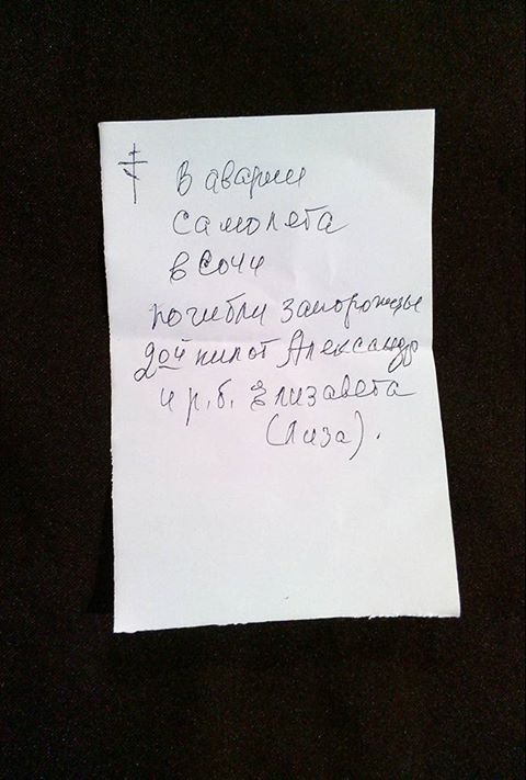 Священник из Запорожья Александр Овчаренко обнародовал на своей странице в фейсбуке фото записки на панихиду, которую ему подали прихожане на 9 день после трагедии. В ней сказано, что на борту были выходцы из Запорожья.
