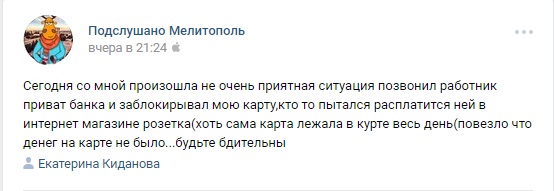 "Сегодня со мной произошла не очень приятная ситуация позвонил работник приват банка и заблокирывал мою карту,кто то пытался расплатится ней в интернет магазине розетка(хоть сама карта лежала в куртке весь день(повезло что денег на карте не было...будьте бдительны".