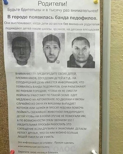 Призыв следить за безопасностью детей и фоторобот троих человек, якобы являющихся педофилами, опубликовали в сети.