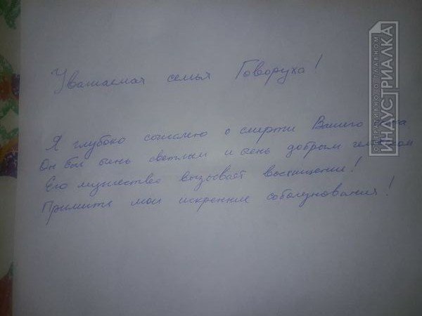 "Уважаемая семья Говоруха! Я глубоко соболезную о смерти вашего сына. Он был очень светлым и очень добрым человеком. Его мужество вызывает восхищение! Примите мои искренние соболезнования!".