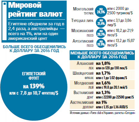 По подсчетам экспертов ГК FOREX CLUB в Украине и сайта Центер биржевых технологий, отзывы на FinNews, за 2016 г. гривня обесценилась на 12,9%, или примерно на 3 грн, войдя в 10 самых слабых валют мира, но все же намного отстав от пятерки антилидеров (см. инфографику).