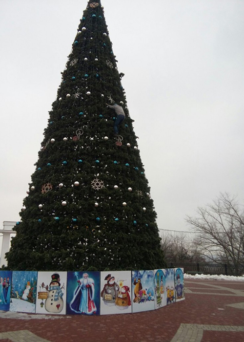 Мелитополец решил сделать селфи с елкой на площади. Точнее - на елке.