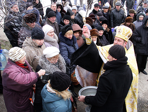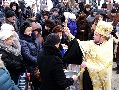 Священник отец Максим, облачившись в торжественное одеяние, приступает к церемонии. Народ начинает говорить тише и даже перестает на некоторое время толпиться у источника, где еще минуту назад все активно набирали воду. На ветру руки священника быстро краснеют, но он словно не замечает этого и быстро-быстро читает строки из Святого Писания.