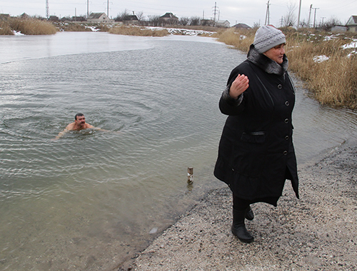 «А зачем? Все ведь спокойно!» – отвечает тот и это действительно так – народ собирается спокойный, уравновешенный, почти все с банками в корзинах. У родника, текущего прямо в озеро, лед у поверхности отступил, и все ждут, кто же первым решится совершить ритуальное тройное омовение в ледяной воде. Мальчик лет трех, надежно укутанный, постоянно задает родителям вопрос: «Люди будут нырять?».