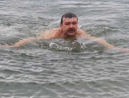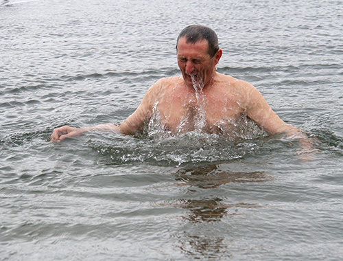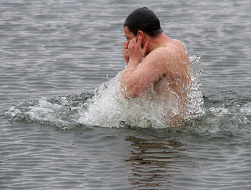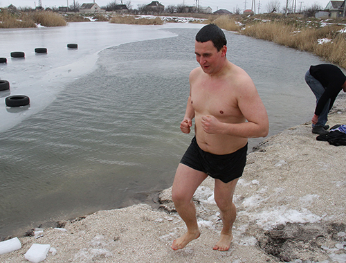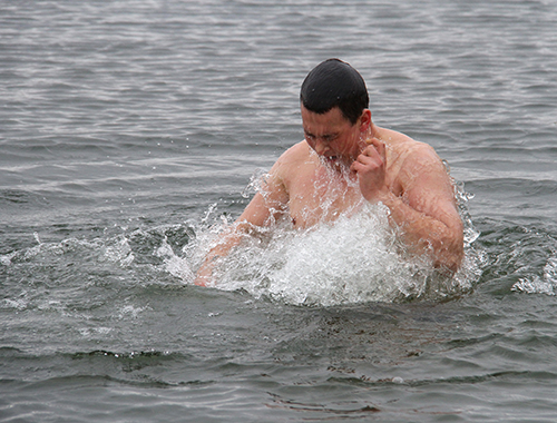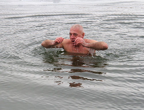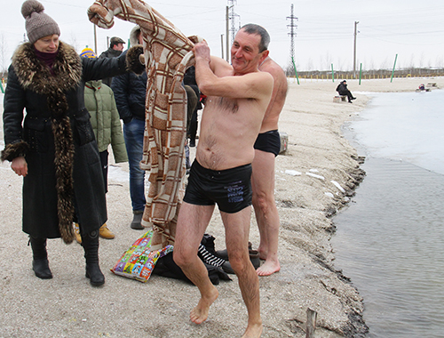 Первый морж словно прорывает плотину народной решимости и мужчины один за другим, стремительно раздеваясь, заходят в ледяную воду. Многие крестятся после каждого погружения.