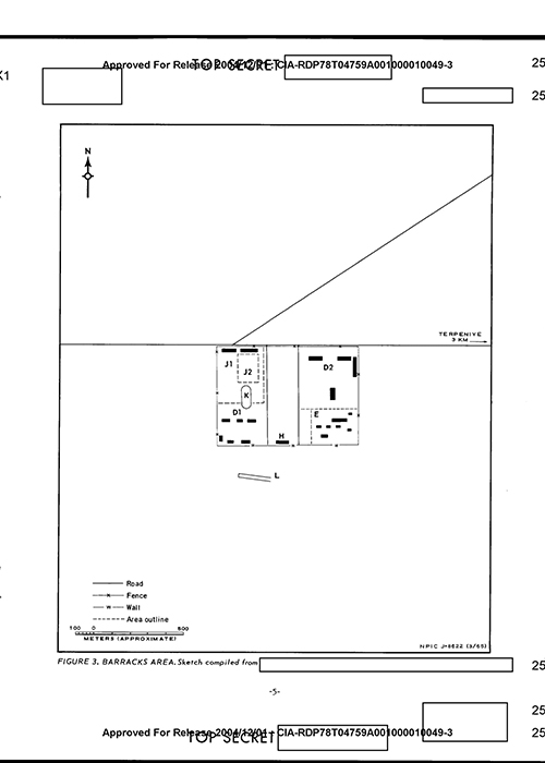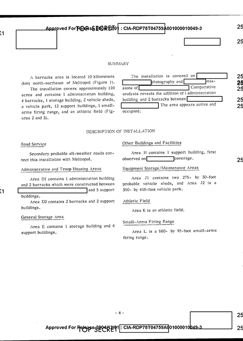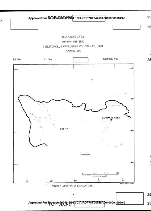 Также ЦРУ заинтересовали казармы воинских подразделений в 10 км севернее Мелитополя. В секретном файле есть как спутниковые снимки, так и план размещения казарм (документ составлен в 1965 году)