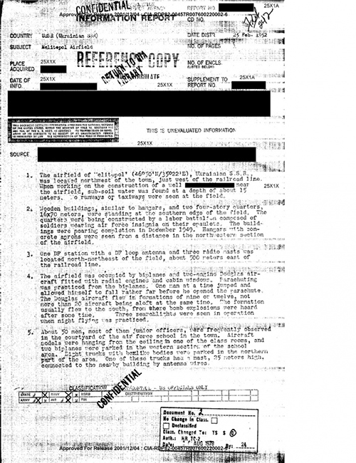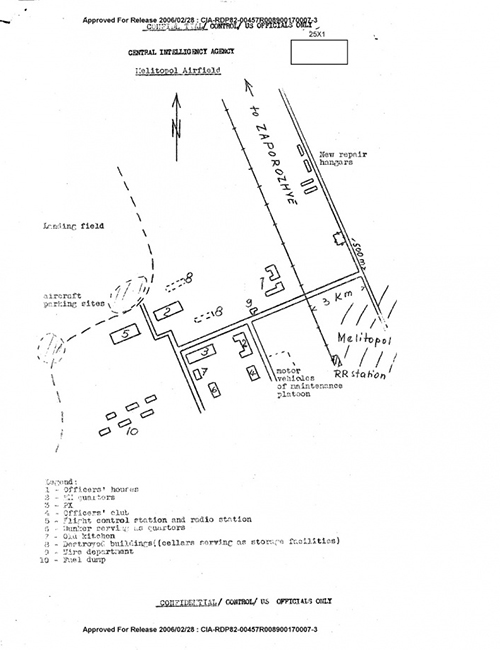 Шпионов ЦРУ больше всего интересовала информация о военном аэродроме г.Мелитополя. В архиве ЦРУ опубликованы карты, спутниковые снимки и описание аэродрома.