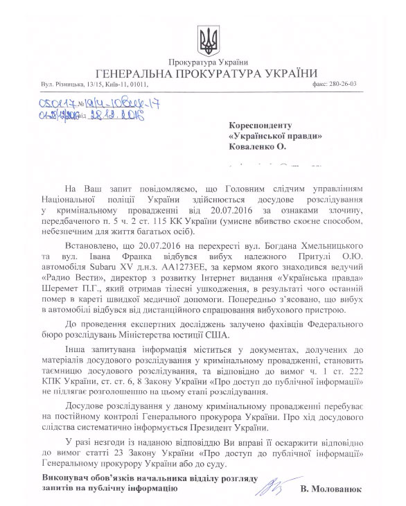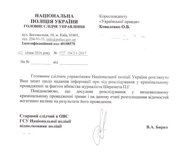 В Нацполиции "Украинской правде" сообщили, что "расследование в вышеуказанном уголовном производстве продолжается, и на данном этапе разглашение сведений негативно повлияет на результаты его проведения".