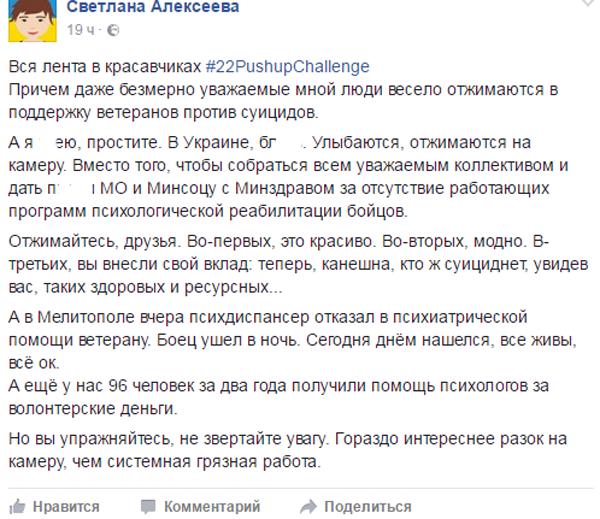 Волонтер на своей странице резко высказалась по поду проводимого флешмоба в поддержку ветеранов против суицидов. Она считает, что государство и общество делает недопустимо мало для людей, прошедших войну.