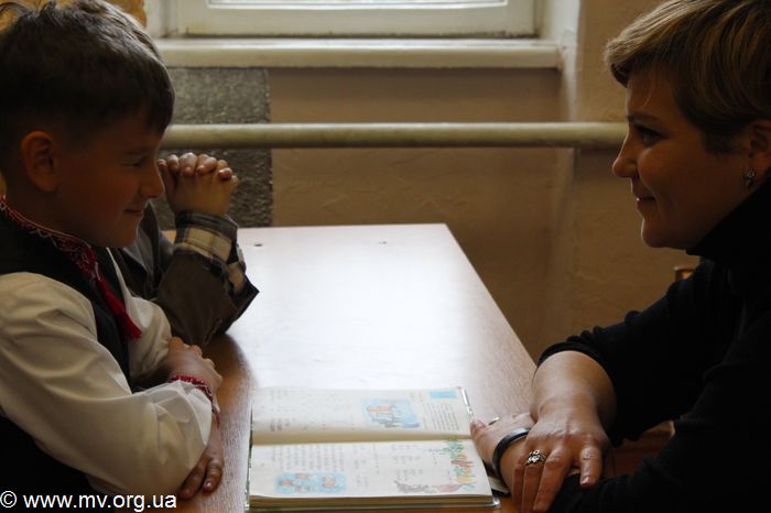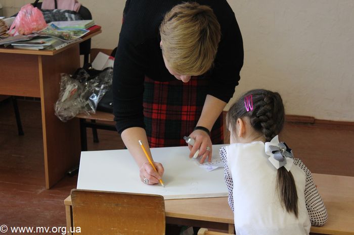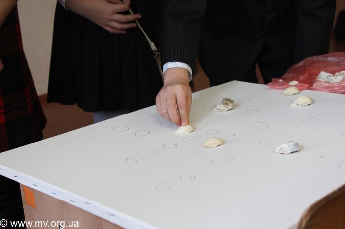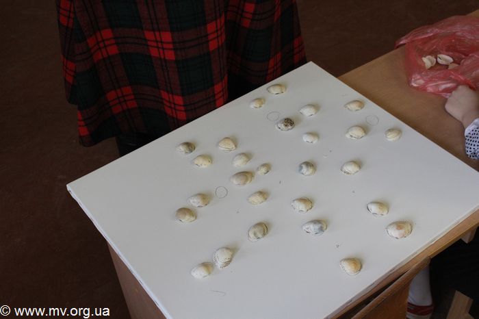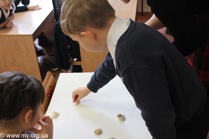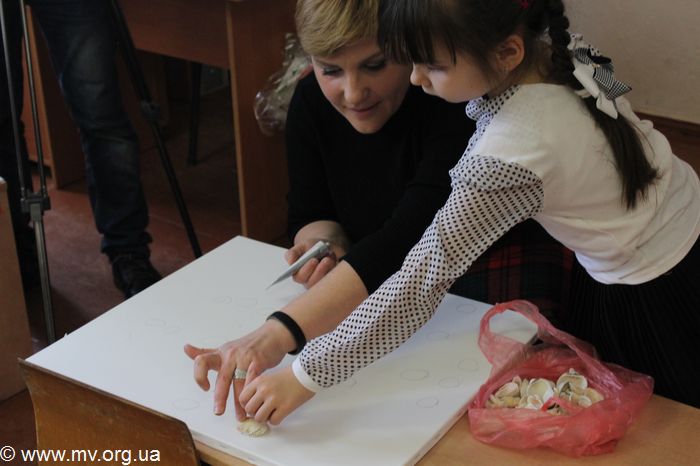 А затем весь класс принял участие в создании плаката шрифтом Брайля, вот только технология была несколько иной. Выпуклости на холсте создавались не традиционным прокалыванием бумаги с обратной стороны, а приклеиванием на холст красивых морских ракушек. Каждый ученик подходил к Елене, выбирал себе ракушку и точку, на место которой она клеилась, затем придерживал ее на холсте. Лишь один стеснительный первоклассник отказался принимать участие в создании "картины". Дети выкладывали ракушками фразу "Я розумію", как символ того, что они понимают проблемы незрячих.